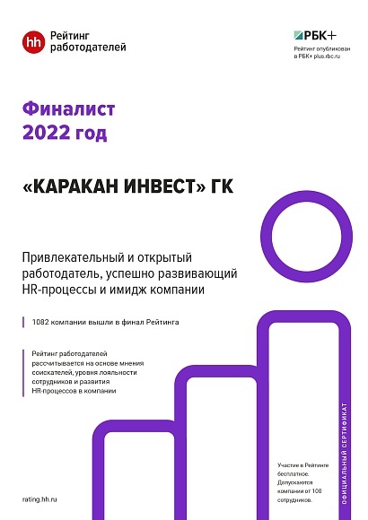 Крупнейший портал страны по поиску работы и работников hh.ru подвел итоги ежегодного исследования и опубликовал рейтинг работодателей России. Группа компаний «Каракан Инвест» прошла все этапы испытания, вышла в финал и заняла 123 место среди крупных компаний страны (численностью от 1 001 до 5 000 чел.). Всего в категории «крупные компании» вышли в финал 268 организаций.